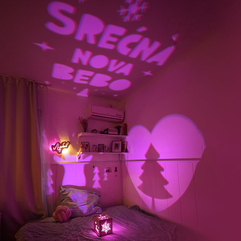 Magic Light Box je drvena lampa sa pažljivo izrezanim motivima na 5 strana koji se projektuju na zidove i plafon. Možete izabrati između LED diode u jednoj boji ili se odlučiti za RGB diodu sa punim spektrom boja koje se podeševaju preko aplikacije na mobilnom telefonu. Cena sa našim unapred izabranim motivima iznosi 3900 RSD, dok je cena sa RGB diodom 4900 RSD. Dodatno personalizujte svoju Magic Box sa tekstom i datumom po želji, dajući joj lični pečat. Za sve informacije, slobodno nas kontaktirajte putem maila, WhatsApp-a ili Instagrama. Vaša magija je na dohvat ruke.